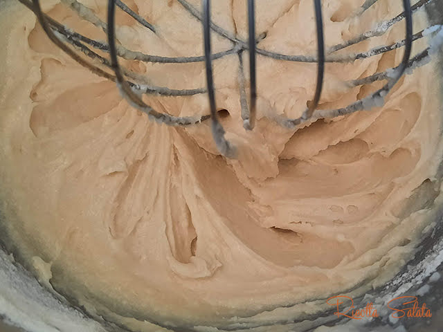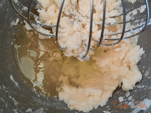 Mescolare a mano con una frusta, in alternativa si può usare anche lo sbattitore elettrico. Io per esempio ho utilizzato la planetaria a velocità molto bassa, fino a ridurli in una crema omogenea. Aggiungere metà degli albumi e il sale e continuare a mescolare.