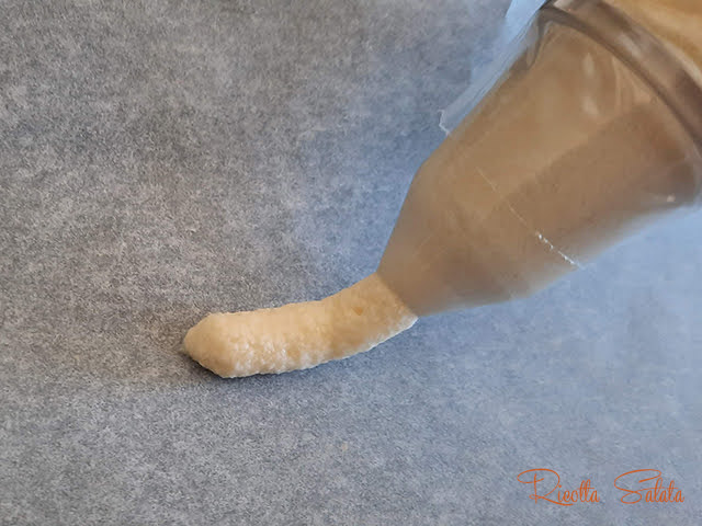 A questo punto, sarebbe meglio far riposare il composto 10 minuti in frigo. Nel frattempo preriscaldare il forno a 200°. Successivamente trasferire in una sac à poche con bocchetta liscia piuttosto grande, tipo 8 o 10 mm formare dei bastoncini.