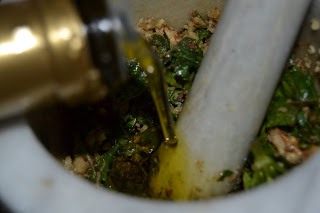 Unire olio a filo fino ad ottenere un pesto omogeneo e non troppo asciutto.