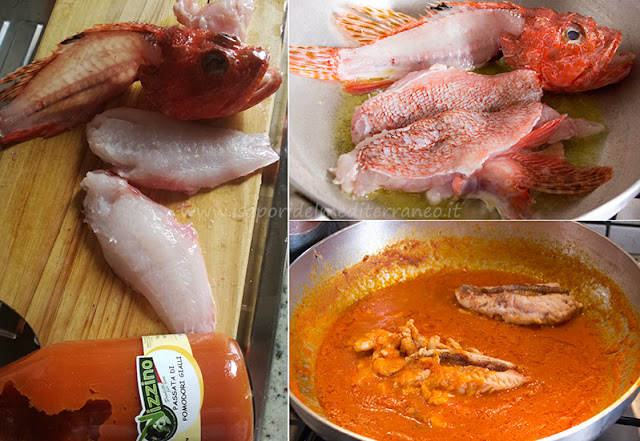 A questo punto aggiungete la passata di pomodori gialli Vizzino che farete insaporire per due tre minuti con le lische e la testa dello scorfano e 3 bicchieri di acqua calda. Proseguite la cottura per circa 20 minuti o finchè l’acqua non sarà del tutto evaporata, aggiustate di sale.