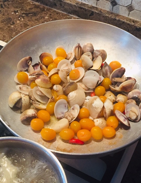 In una padella ho soffritto uno spicchio d’aglio e un peperoncino, ho aggiunto le vongole e i pomodorini. Ho aggiunto l’acqua filtrata rilasciata dalle vongole.