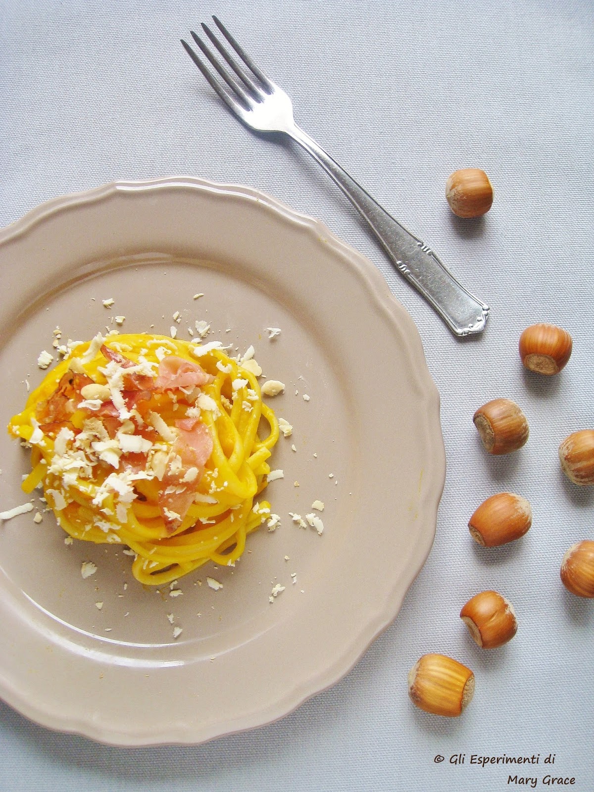 Scolare le linguine al dente e trasferirle nel tegame contenente il condimento a base di zucca. Mescolare bene e completare ogni porzione con lo speck croccante, le nocciole tritate grossolanamente ed una spolverata di ricotta affumicata grattata con una grattugia a fori grossi.
