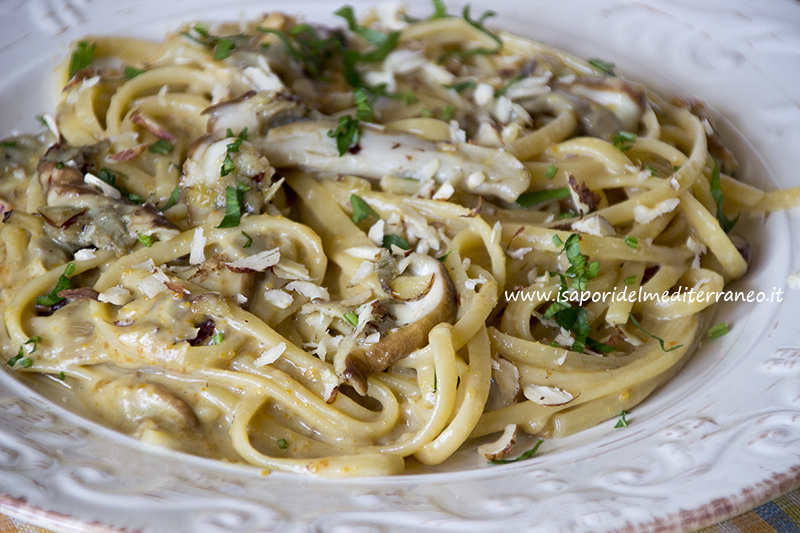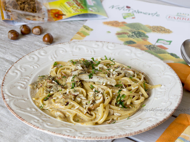 Lessate la pasta in abbondante acqua salata e scolatela al dente , avendo cura di conservare un mesto di acqua di cottura. Versatela nella padella con il condimento preparato e mescolate aggiungendo se rimane asciutto, tutta o parte dell’acqua conservata. Girate rapidamente e servite guarnendo con del prezzemolo tagliato al momento, nocciole e pepe.