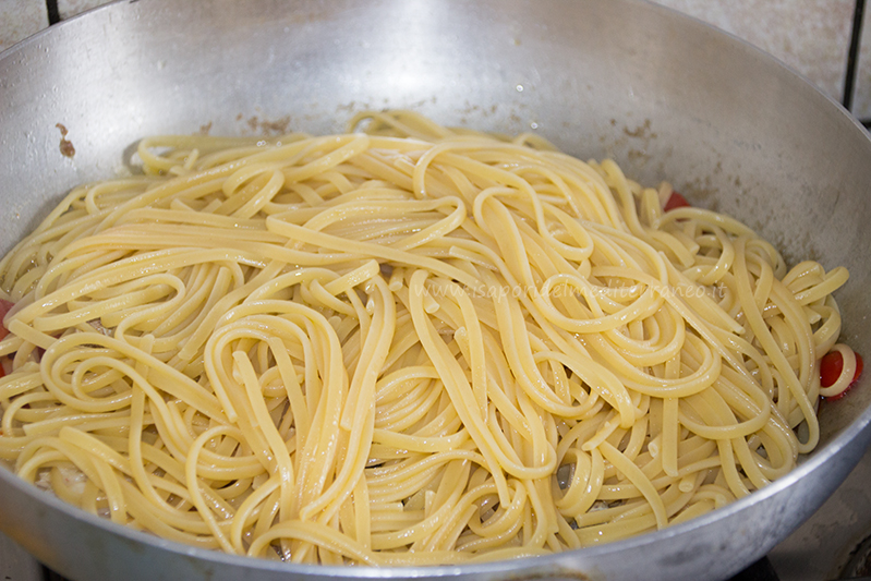 - In una pentola con acqua salata cuocete le linguine, e cinque minuti prima della fine della cottura versateli nel sughetto di pesce con mezzo mestolo di acqua di cottura della pasta.