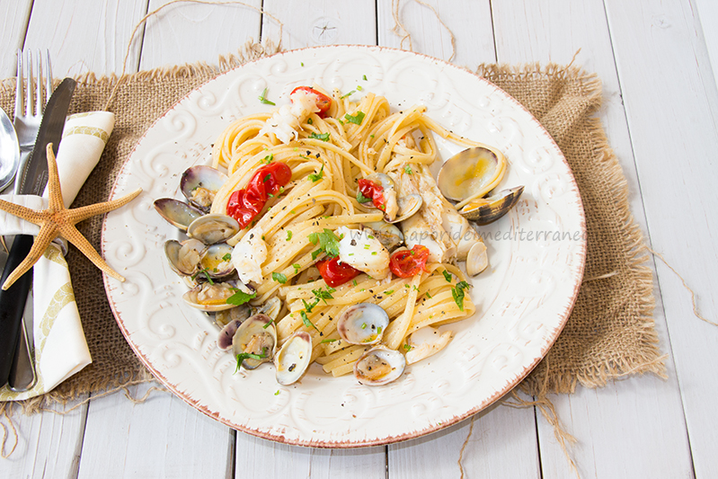 Seconda ricetta per l’Mtchallange della sfida n°67 della pasta con il pesce, proposta da Cristina Galliti del blog Poveri ma belli e buoni. Dopo lo scoglio completo, ho eseguito una pasta alla pescatora con l’aggiunta di qualche mollusco. Nel regolamento di questo mese si fanno due distinzioni: le paste “allo scoglio” e quelle “alla pescatora”. Le prime sono esclusivamente a base di molluschi, cefalopodi e crostacei, le seconde si fanno invece con i pesci da lisca. A mio modesto parere, non tutti i peschi da lisca possono essere mischiati con molluschi, ad esempio: uno scorfano non potrebbe mai essere mischiato con nessun mollusco , le ragioni si trovano nel sapore e identità ben marcato di questo pesce. Infatti le fettuccine allo scorfano è un piatto tipico secolare di Capri. Partiamo sempre da un principio base, di solito il gusto è soggettivo, ma oggi si fanno abbinamenti senza senso solo per esaltare le proprie doti che poi risultano fallimentari rispetto alla tradizione. Buona l’innovazione nella tradizione senza esagerare. Diverso invece è il discorso della rana pescatrice, che avendo un sapore più dolciastro, sposa benissimo con i frutti di mare che danno un ottima sapidità al piatto. In queste preparazioni, l’ingrediente principe, il pesce, deve essere fresco o quasi vivo, qui il pescivendolo di fiducia, per chi abita lontano dalla costa gioca un ruolo fondamentale. Un altro ingrediente che fa la differenza nei piatti di pesce è l’olio extra vergine di oliva, sopratutto quando si scegli di usare poco pomodoro.