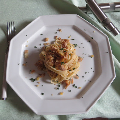 Tritate grossolanamente il pane, sia la crosta sia la mollica e rosolatelo in padella aggiungendo ancora un filo di olio extravergine finchè non sarà dorato e croccante, a questo punto aggiungete anche il tonno spezzettato grossolanamente con i rebbi di una forchetta.
