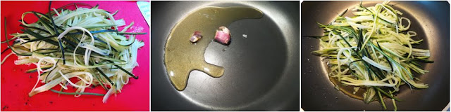 Con l’aiuto di una pinza per cucina, arrotoliamo la pasta all’interno di un mestolo ed adagiamola al centro del piatto. Prendiamo un po’ di zucchina e mettiamola sulla sommità della pasta. Tagliamo ad anelli sottili un po’ di peperoncino ed a fettine un po di mandorle quindi guarniamo e concludiamo con una macinata di pepe ed un filo d’olio.