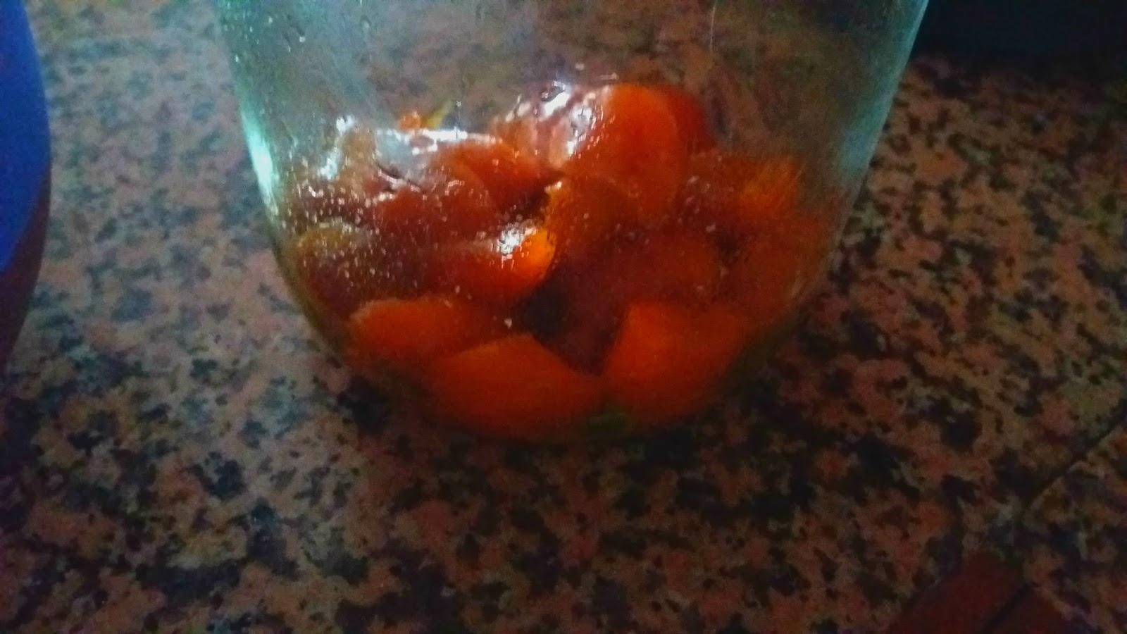 In un barattolo grande versare le albicocche snocciolate ,e 4/5 ossa schiacciati,coprire con 800g.di