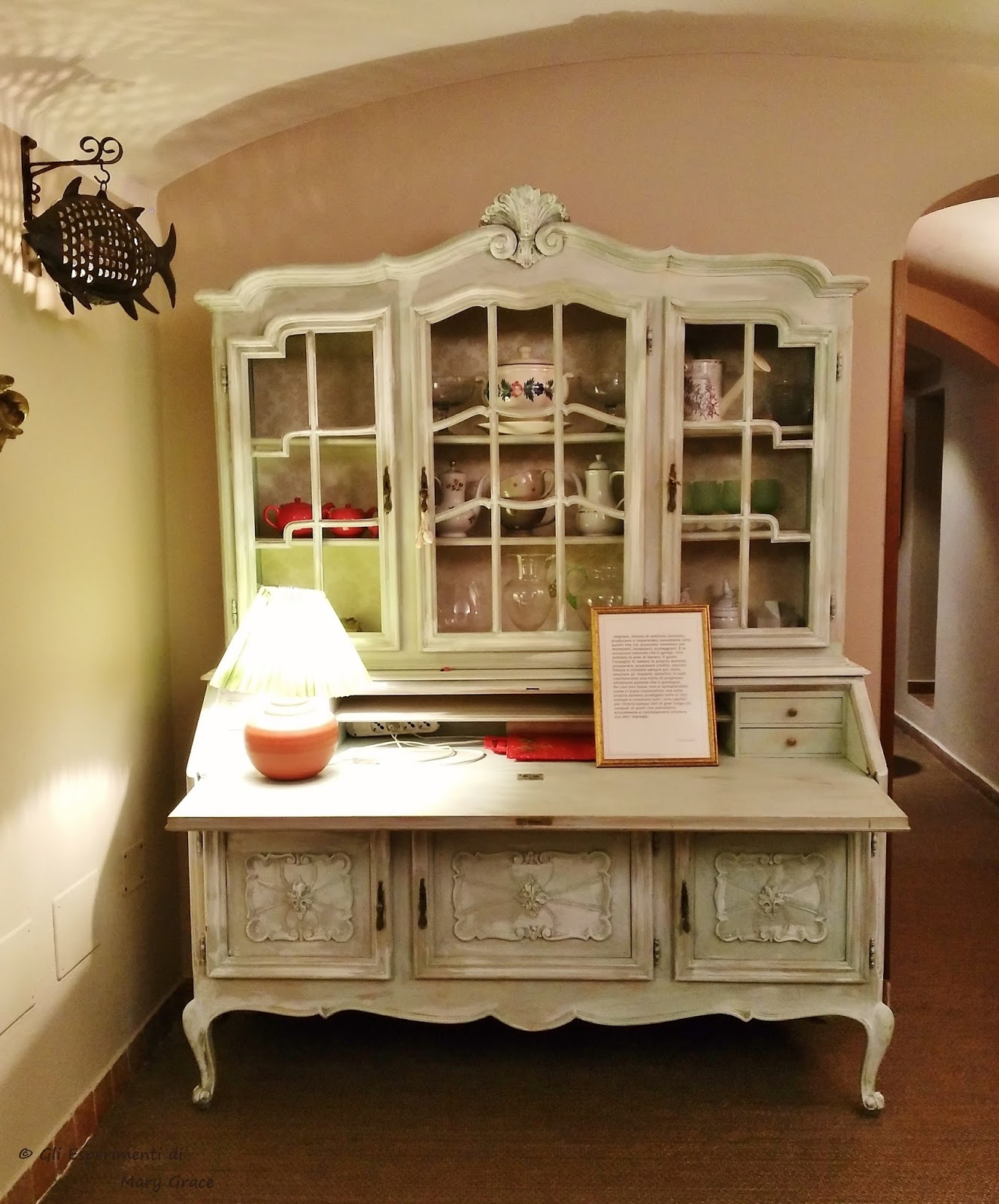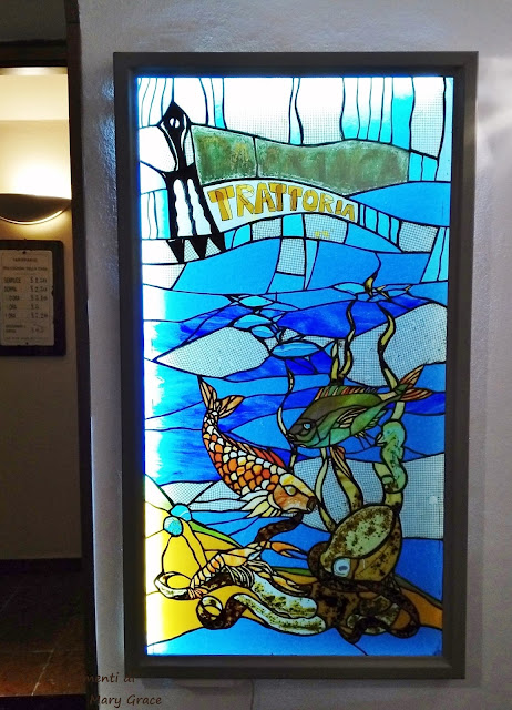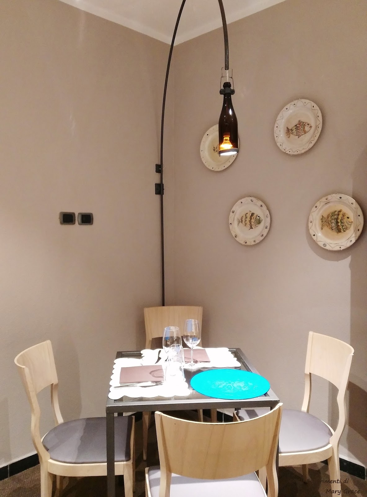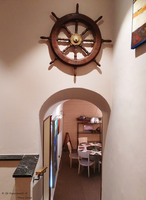 Ritroviamo la magia delle luci in bottiglia che qui illuminano, affisse alle pareti chiare e delicate, le rotte percorse dall’amatissimo ed indimenticabile capitano Tazio, compagno di una vita della Signora Patrizia.