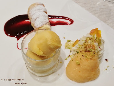 Questo percorso di gusto non poteva che concludersi con l’ennesima espressione del talento di Chef Mirco Cogo che mi saluta con un Tris composto da Ricotta Dolce con Canditi e Pistacchi Tritati, Spuma di Agrumi e Pasta Sfoglia a forma di Cannolo fatta in casa con Crema di Mascarpone e Coulis di Frutti Rossi.