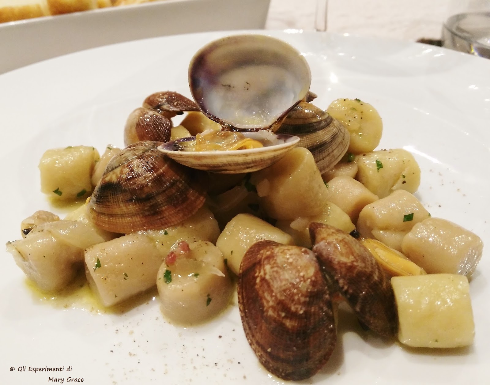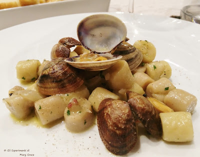 Con gli Gnocchetti di Farina di Castagne con Vongole, Speck Croccante e Cipolla Rossa Brasata, lo chef crea un incontro impeccabile tra mare e terra.