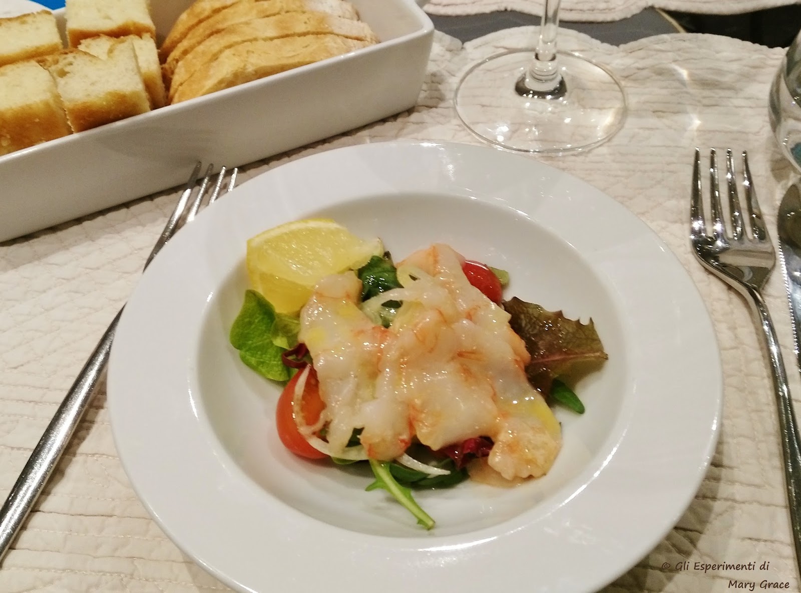 I crostacei sono la seconda proposta dello chef. Una crudité tagliata al coltello accompagnata da insalatina freschissima.