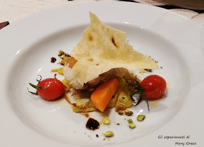 Ad accompagnarla pomodori datterini dolci come caramelle, carciofi e carote croccanti, e granella di pistacchi.