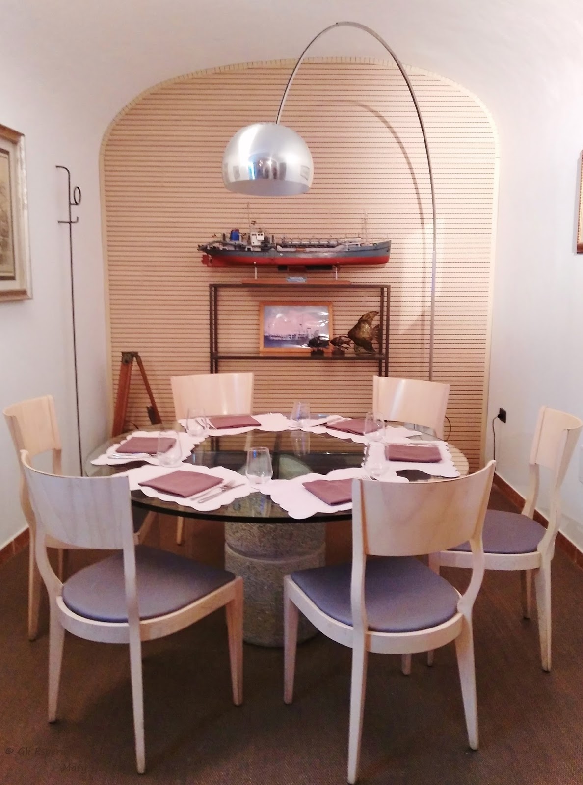 Ritroviamo la magia delle luci in bottiglia che qui illuminano, affisse alle pareti chiare e delicate, le rotte percorse dall’amatissimo ed indimenticabile capitano Tazio, compagno di una vita della Signora Patrizia.