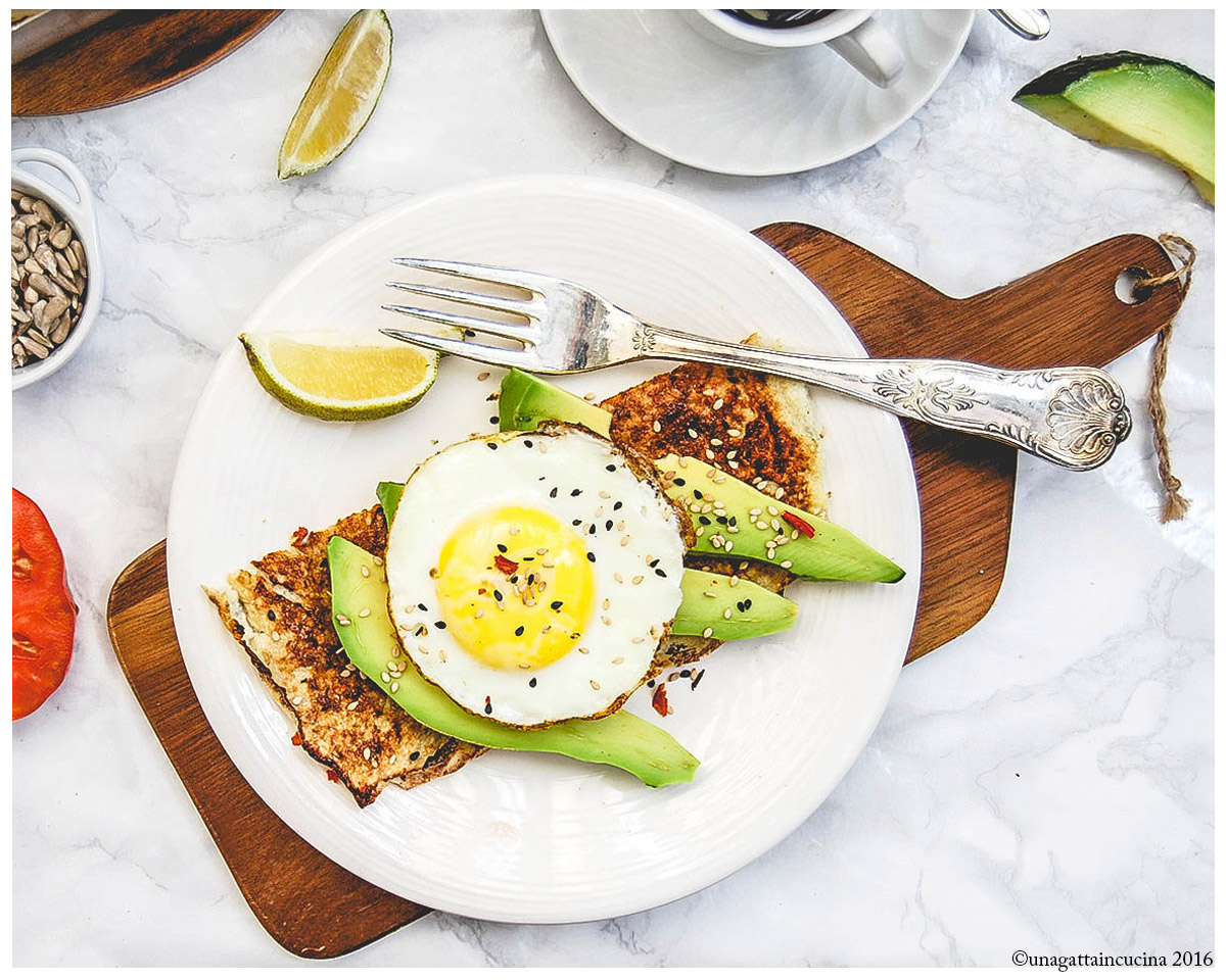 Componete il toast con la base di cavolfiore, le fettine di avocado e infine adagiate sopra l’uovo.