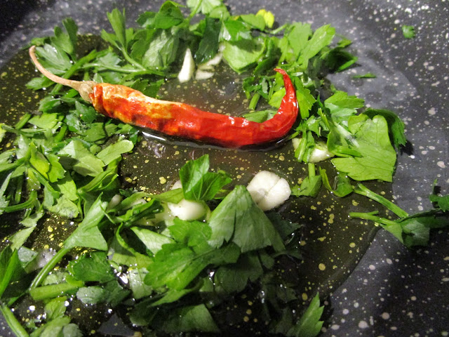 - preparare, in una padella, il soffritto con olio d’oliva,peperoncino,aglio tritato e prezzemolo tritato