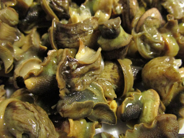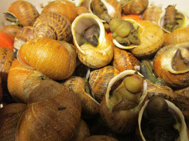 -a questo punto si possono scolare le lumache e , quando si saranno intiepidite, estrarle dal guscio e eliminare il budello lasciando solo il mollusco, mettere da parte.