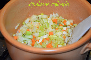 Nel frattempo, in una pentola di coccio, preparare un soffritto con olio e tutte le verdure tritate, unire le lumache, rosolare per una decina di minuti, sfumare con il vino bianco a fuoco alto.