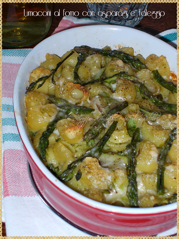 Ho condito i lumaconi, ma poteva essere un’altra pasta corta, con una purea di asparagi ottenuta da parte dei gambi lessi, gli altri li ho tagliati a rondelle, infine ho aggiunto le punte e dadini di Taleggio che, con il suo sapore sapido, ha donato un elemento in più; il tutto gratinato in forno, per avere quella crosticina che amo molto.