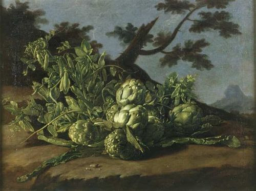 | Luis Meléndez, Natura morta con carciofi e piselli in un paesaggio, Collezione privata |