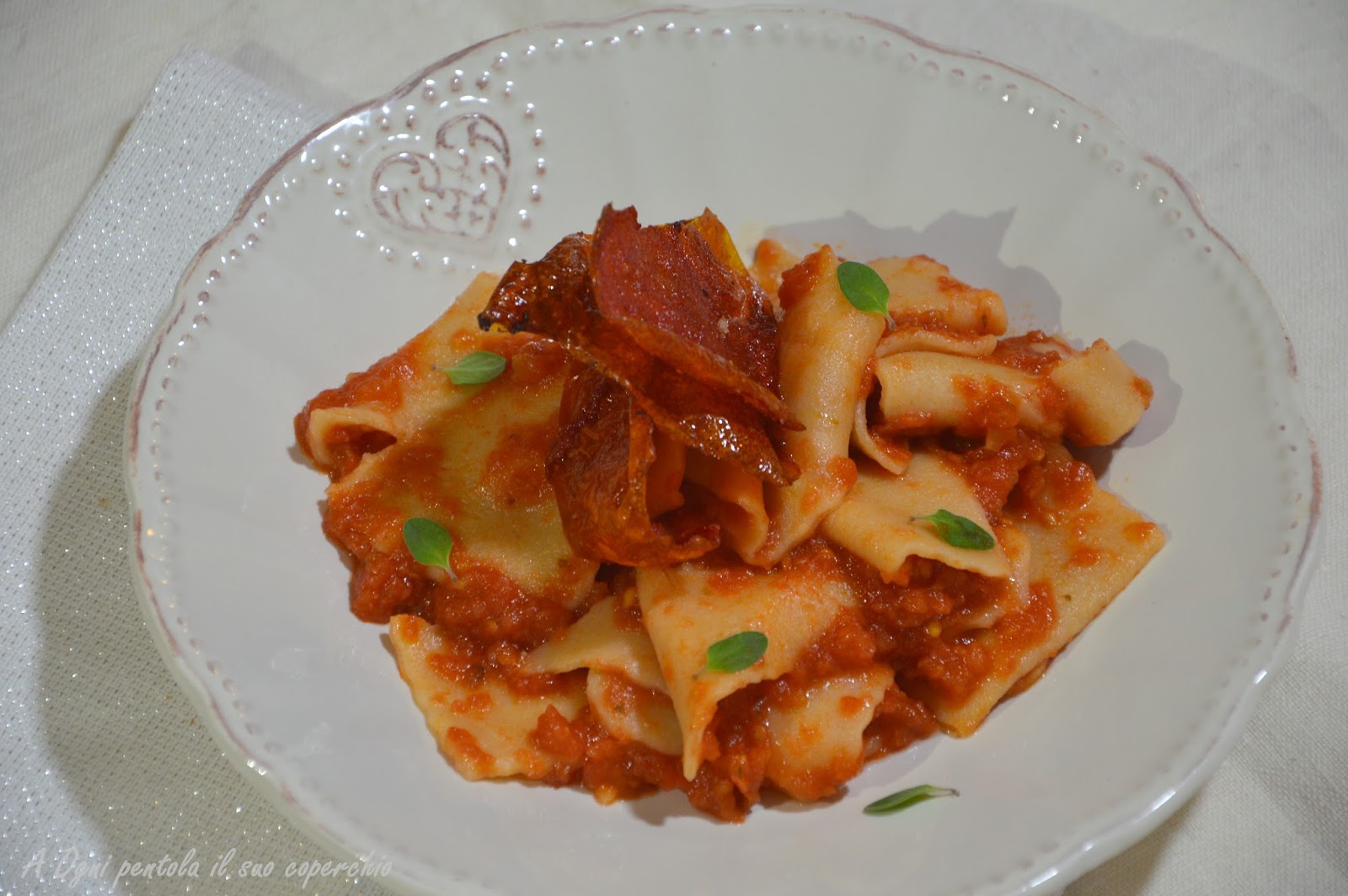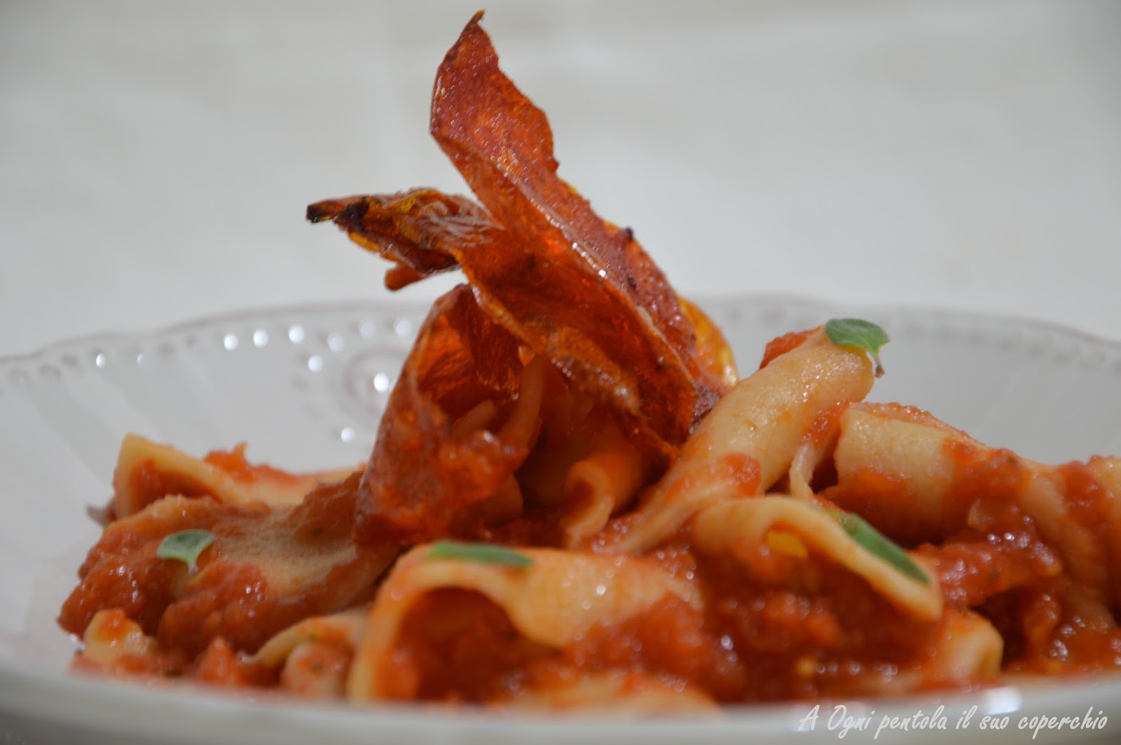 Così ho deciso di utilizzare i filetti di pomodoro della Mediterranea Belfiore, appena ho aperto il barattolo un profumo di pomodoro e basilico ha conquistato la cucina e mi sono ritrovata in piena estate.. Per la serie “non si butta via niente” ho recuperato l’acqua di conservazione ed ho messo a scolare i filetti in modo da recuperare tutto il liquido, con l’acqua di pomodoro ho fatto una pasta fresca con semola rimacinata. La polpa dei filetti l’ho frullata con un pò di origano fresco e ne ho poi ricavato una salsa.. e le bucce? Le ho buttate via… certo che no! Le ho fritte e le ho messe a completare il piatto..Nascono così i miei Maccheroni (a casa mia si chiamano Maccheroni anche se nel resto della Toscana si chiamano Maltagliati) con pomodoro sopra, sotto dentro e fuori.