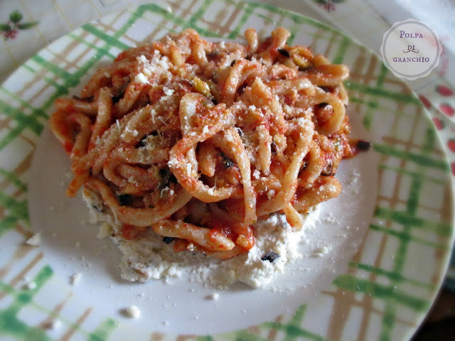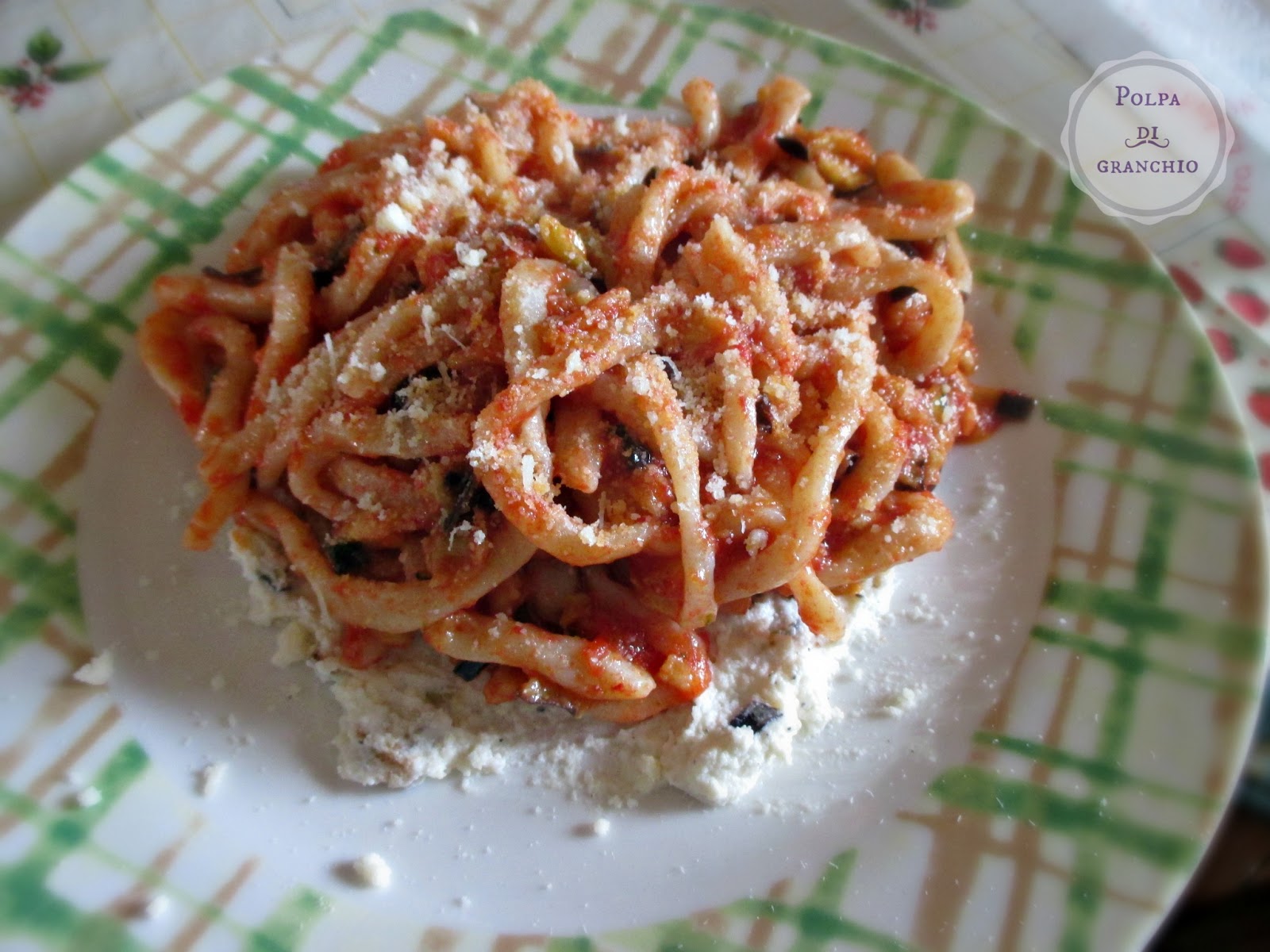 Una volta cotta calate la pasta e ripassatela nel sugo, fate amalgamare bene e componente il piatto come più vi piace: io ho messo alla base del piatto la ricotta e poi una forchetta di pasta; nulla toglie che la ricotta possa essere messa direttamente dentro il sugo però eh…