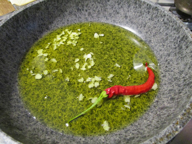 - in una padella aggiungere 30 gr. di olio extravergine d’oliva, il peperoncino e gli spicchi d’aglio tritati fini
