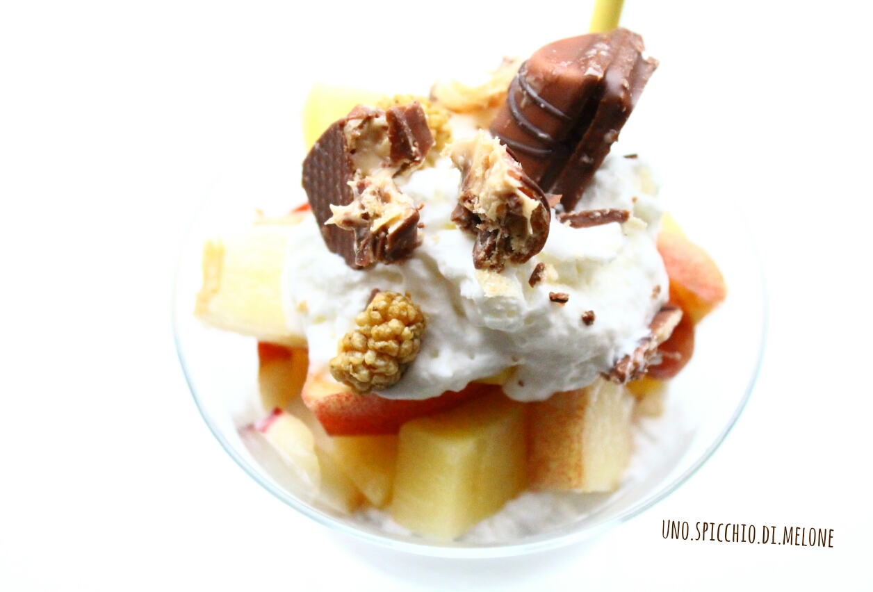 Ora siamo pronti per comporre le nostre coppe, alternando strati di macedonia a strati di panna e…completando con delle belle barrette di cioccolato…