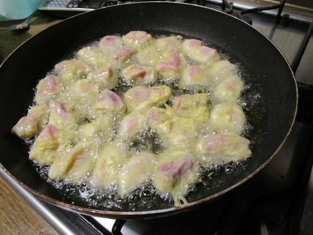 - nel frattempo , in una padella antiaderente o nel wok, mettere abbondante olio di semi di arachidi e friggere i bocconcini di carne pastellati, uniformemente
