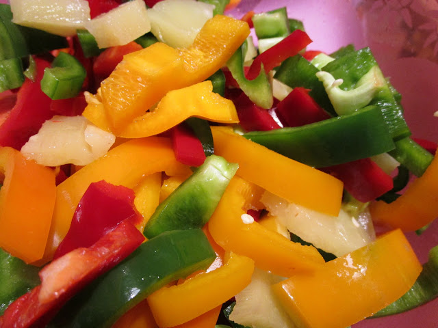- versare nella padella l’olio d’oliva, l’ananas a pezzetti e i peperoni tagliati a listarelle