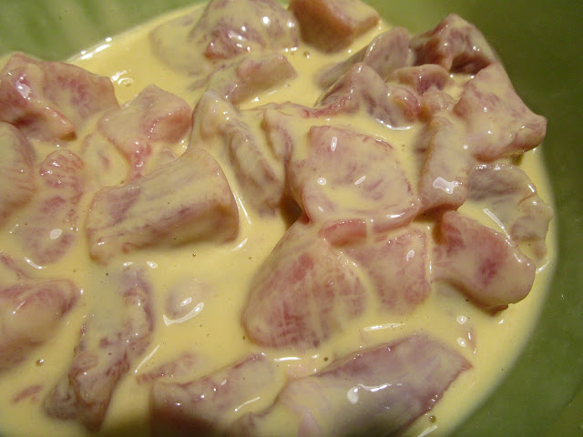 - immergere i cubetti di carne nella pastella e avvolgerli uniformemente nel composto