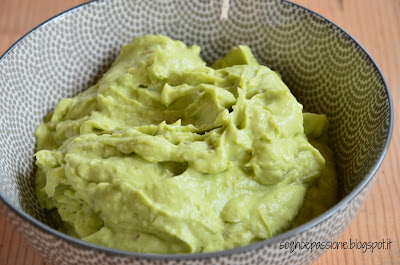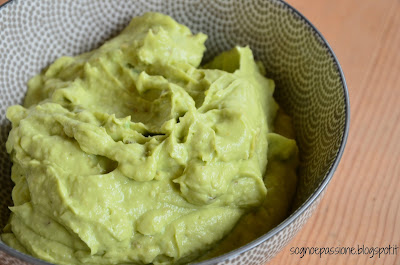 Pulite l’avocado e tagliate la polpa a fettine; frullate tutti gli ingredienti nel mixer finché otterrete una crema densa.