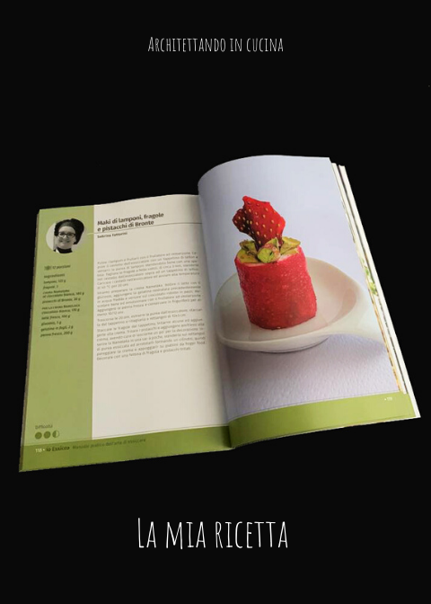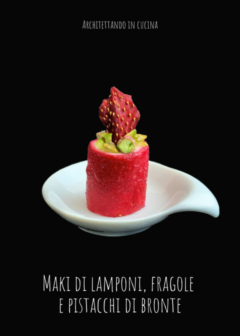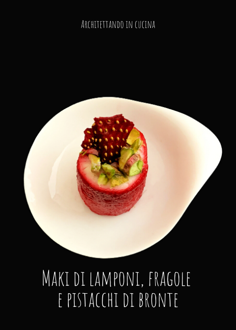 Ma veniamo alla ricetta. E’ un finger food adatto per un buffet o servito come pre dessert. La pezzatura è pensata per un solo boccone. Ha un bel contrasto in bocca tra il sapore acidulo del lampone (intensificato dall’essiccazione) e quello dolce e morbido della crema al cioccolato bianco. Contrasto esaltato dalla sapidità e croccantezza dei pistacchi. Le fragole all’interno e sopra, parzialmente reidratate dall’umidità della crema, restano comunque presenti in bocca e danno ulteriore masticabilità. Il lampone all’esterno, anch’esso parzialmente reidratato dalla crema, si mantiene compatto per contenerla, ma morbido al palato.