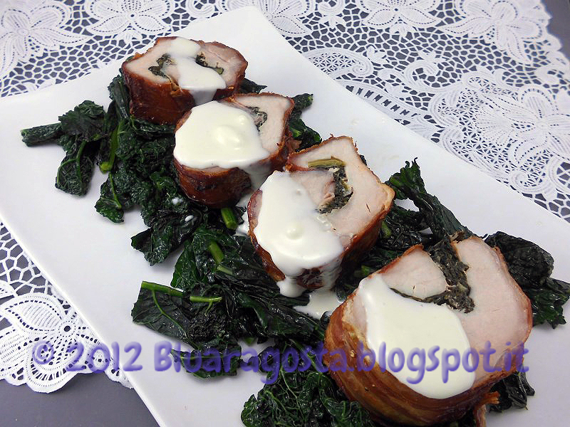 Adesso abbiamo tutto pronto, e in tempo per la cena! Ho tirato fuori dal forno i miei arrosti, li ho fatti riposare coperti da della pellicola di alluminio per una decina di minuti per far distendere le fibre e per far si che i succhi si stabilizzassero all’interno , li ho tagliati a fette e li ho serviti su un vassoio con un letto del rimanente cavolo nero, inutile dire che profumo che si sprigionava appena aperto il forno! A nostro piacimento possiamo condire i rotolini con la fonduta oppure metterla in coppette dove ognuno si servirà da sé.