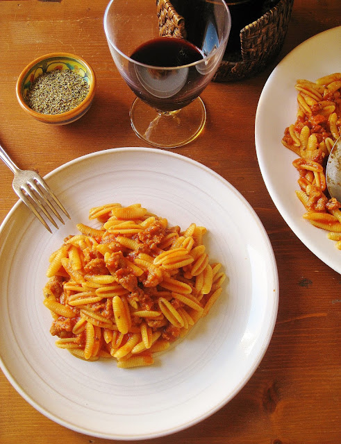 Lessare gli gnocchetti sardi in acqua bollente salata, scolarli e condirli con il Sugo alla Campidanese.