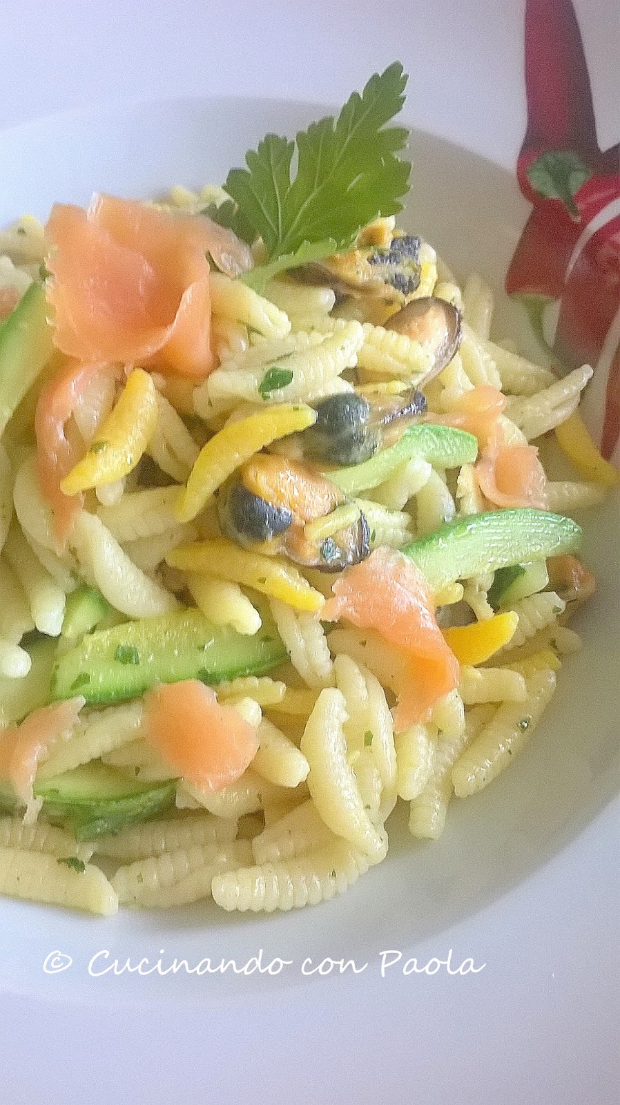Ora aggiungete le zucchine cotte nella padella delle cozze. Cuocete I Malloreddus allo Zafferano per 12 minuti, meglio un po’ al dente. Saltate la pasta nella padella con le zucchine e cozze, cospargete con il prezzemolo tritato. Per ultimo aggiungete i straccetti di salmone affumicato e mescolate. Buon appetito!