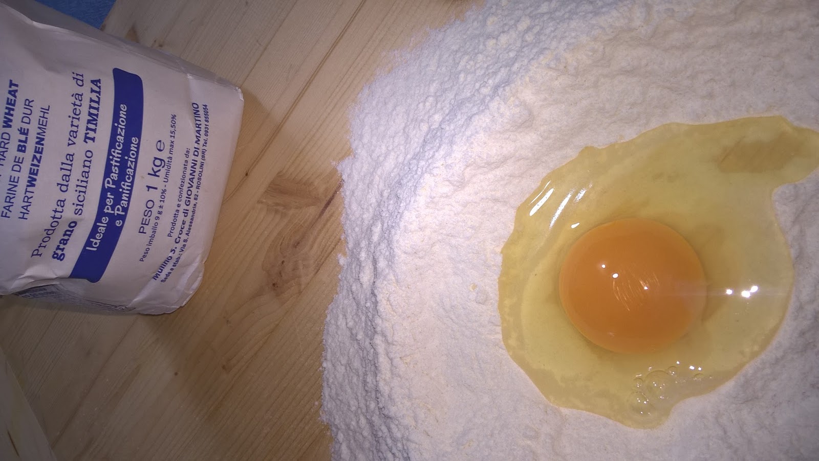 Preparo la pasta impastando 100 g di farina di Tumminia e un uovo per persona. Ottengo un impasto bello sodo, faccio riposare per un quarto d’ora circa.