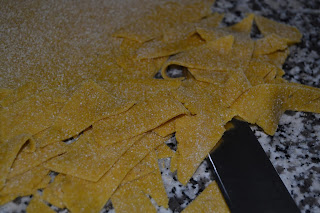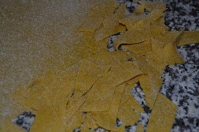 Tagliare i maltagliati con una coltellina ben affilata, poi stenderli su un canovaccio pulito, rivoltandoli di tanto in tanto perché non si ammassino troppo e aggiungendo un po’ di semola all’occorrenza.