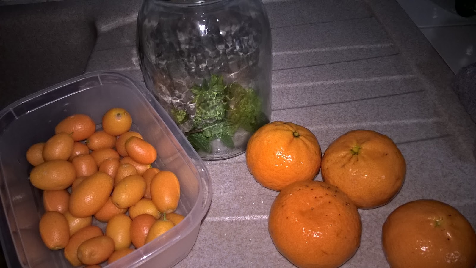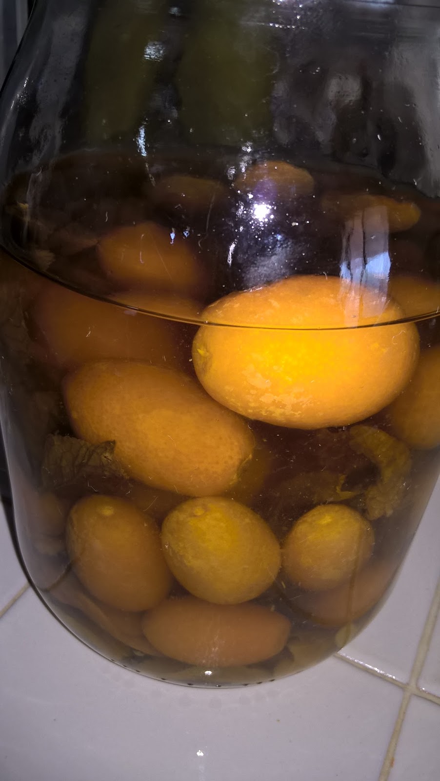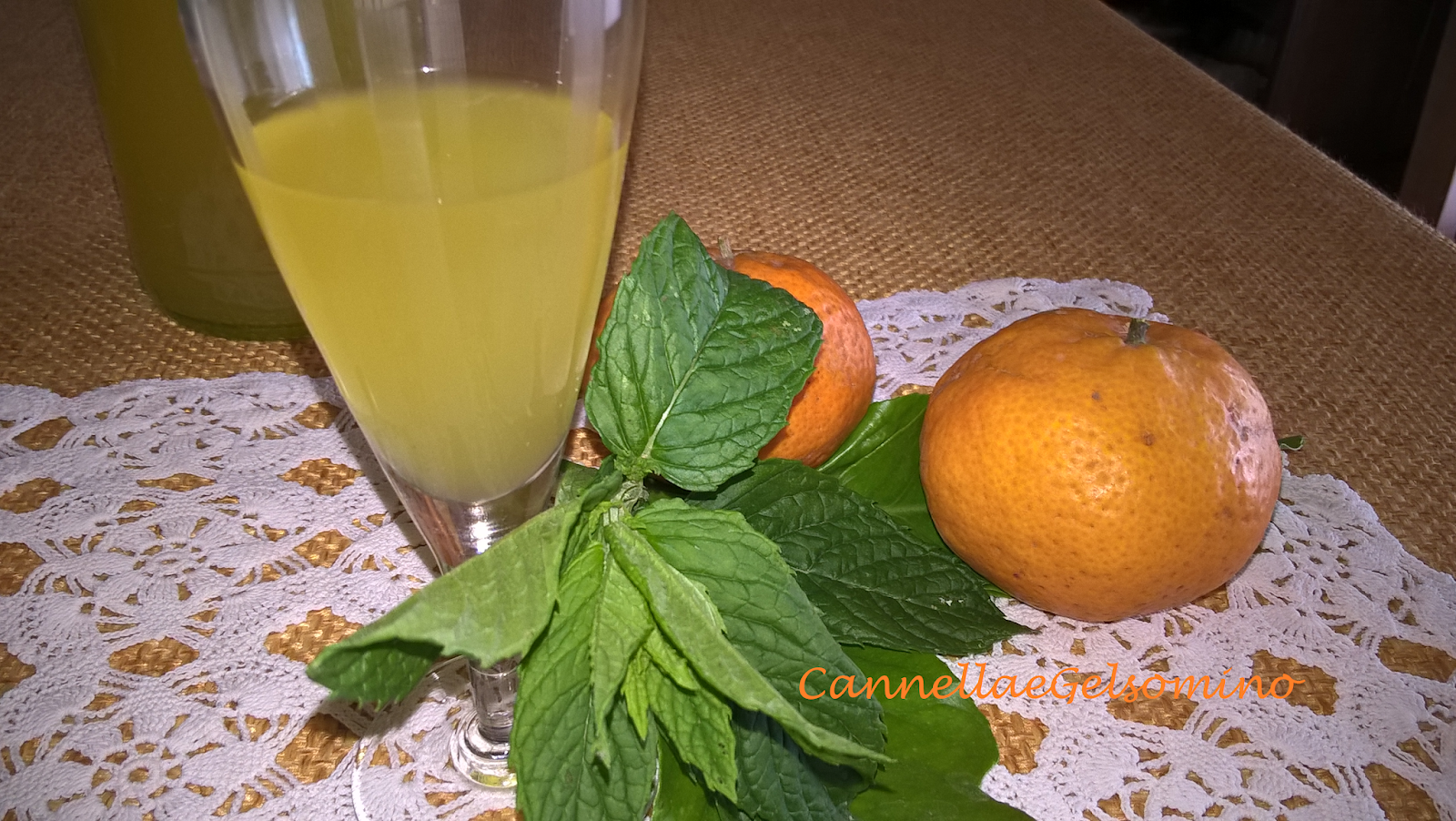 Ingredienti: 1 l di alcol puro, 1 l di acqua, 800 g di zucchero, 4 mandarini, 20 kumquat, due ciuffetti di menta fresca.