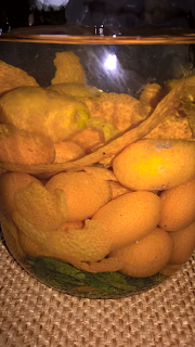 Mettete i kumquat interi, le scorzette dei mandarini (privi della parte bianca), la menta con l’alcol in un barattolo. Tenetelo al buio per circa un mese.