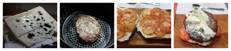 Ora non vi resta che cuocere gli hamburger di Angus, sempre all’interno del cestello della friggitrice. La carne la preferisco leggermente al sangue quindi io gli ho cotti per 10 minuti a 200° leggermente salati in superficie. Una volta cotti ho aggiunto sulla superficie il Roquefort sbriciolato e ho prolungato la cottura ancora un minuto giusto il tempo di farlo sciogliere. Dopodiché ho subito assemblato i panini sistemando l’hamburger sulla prima fetta di pane aggiungendo sopra 2 fette di bacon per ogni panino e richiudendo con l’altra metà del pane.