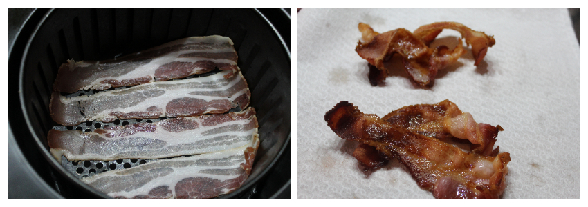 Cuocete il bacon all’interno del cestello della friggitrice ad aria. Disponete le fette sul fondo del cestello e cuocetele per 8 minuti a 200°; trasferitelo su carta da cucina e lasciatelo scolare il grasso in eccesso. La cottura con la friggitrice ad aria lieviterà cattivi odori in cucina il fumo del grasso bruciato, facendo colare i grassi in eccessi sul fondo del cestello.