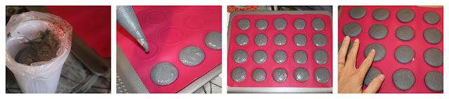 Riempitela con il composto e dopo aver sistemato il tappeto di silicone da macarons su una placca da forno, riempite le formine. Tenete la tasca da pasticcere verticalmente, schiacciate per fare uscire l’impasto partendo dal centro del disco della formina, tenete la punta della bocchetta ferma e riempite il dischetto lasciando circa un cm dal bordo.