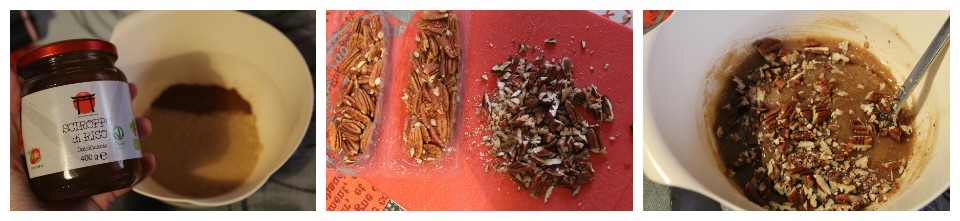 Sbattete leggermente le uova in una ciotola, mentre in un’altra dovete mescolare insieme, lo zucchero, lo sciroppo di riso e le spezie, unite ancora 50 g di noci pecan tritate a coltello e mescolate ancora.