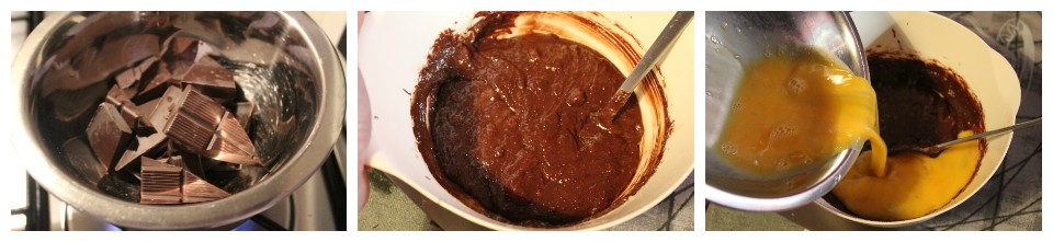 Una volta che il cioccolato è pronto, unitelo al composto di sciroppo di riso e mescolate bene in maniera uniforme, unite ora le uova sbattute e mescolate velocemente, siate forti e tenaci, perchè all’inizio il composto eè molto denso, ma si fluidifica con le uova.