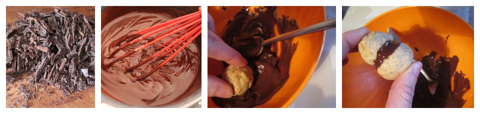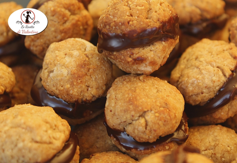 Con le mani, formate delle palline posizionate su una teglia rivestita con carta forno. Schiacciate leggermente le palline e Cuocete in forno per circa 20 minuti a 180°. Fate sciogliere il cioccolato a bagnomaria. Una volta raffreddate unite le due mezze sfere con il cioccolato fuso.