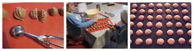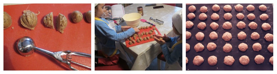 Con un porzionatore da gelato piccolo fate tante palline fino a finire il composto, con una spatola dividetela ancora metà e con le mani Dategli le forme di piccole sfere. Sistematele su una placca da forno schiacciando leggermente e fate cuocere 10 minuti a 180°. Sfornate e lasciate raffreddare completamente.