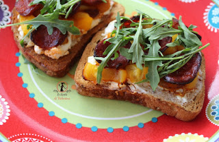 Se servite le tartine calde, decorate le subito con la rucola altrimenti se le preparate in anticipo, aspettate di aggiungerla quando andrete a tavola in modo che non appassisca con il calore.