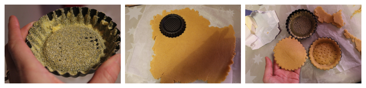 Coprite le tegliette con un pezzetto di carta stagnola e infornate per 10 minuti; rimuovete la carta argentata e con il dorso di un cucchiaio schiacciate giù il fondo delle tartellette, cuocete ancora per 10 minuti. Sfornate e fate raffreddare le tartellette nella teglia, solo dopo dovrete estrarle altrimenti se fate questo passaggio mentre sono calde rischiano di rompersi.