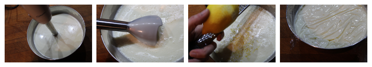 Passate il composto con il minipimer, tenetelo sul fondo della ciotola così da non creare troppa aria nel composto, otterrete una crema liquida ma che velerà il frullatore. Unite infine la scorza del limone e mescolate per inglobarla nella crema. Coprite con la pellicola trasparente a contatto e ponete a riposare in frigorifero per un giorno.